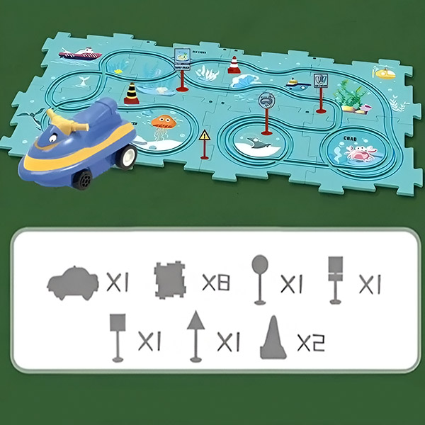 Komplet vključuje različne dele steze, ki otrokom omogočajo enostavno ustvarjanje različnih postavitev, kar izboljša njihovo ustvarjalnost in sposobnosti reševanja problemov.