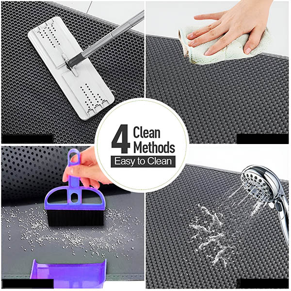 Čiščenje te podloge je enostavno. Preprosto stresite pesek, posesajte ga ali sperite z vodo. Če vaša mačka bruha na podlogo, jo lahko sperete s cevjo; enostavno jo očistite in bo suha. Zaščitite lesena tla in preproge pred neprijetnimi madeži urina. Preprečuje, da bi mačji urin prišel povsod.